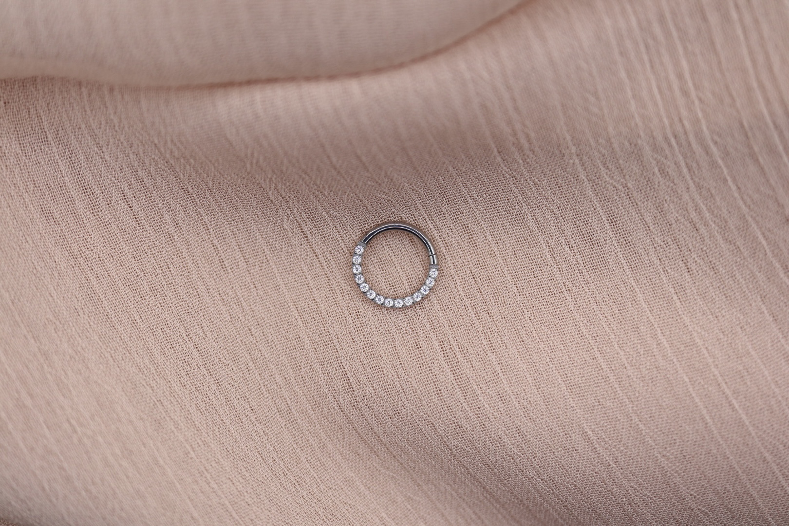 Argola clicker com zircónias. Posição frontal, que faz com que seja mais apropriada para daith ou septum. Uma jóia confecionada em titânio ASTM F-136, o material mais indicado para perfuração corporal, altamente resistente a desgaste e erosão e livre de níquel e outros componentes que possam causar qualquer reação alérgica no corpo humano.