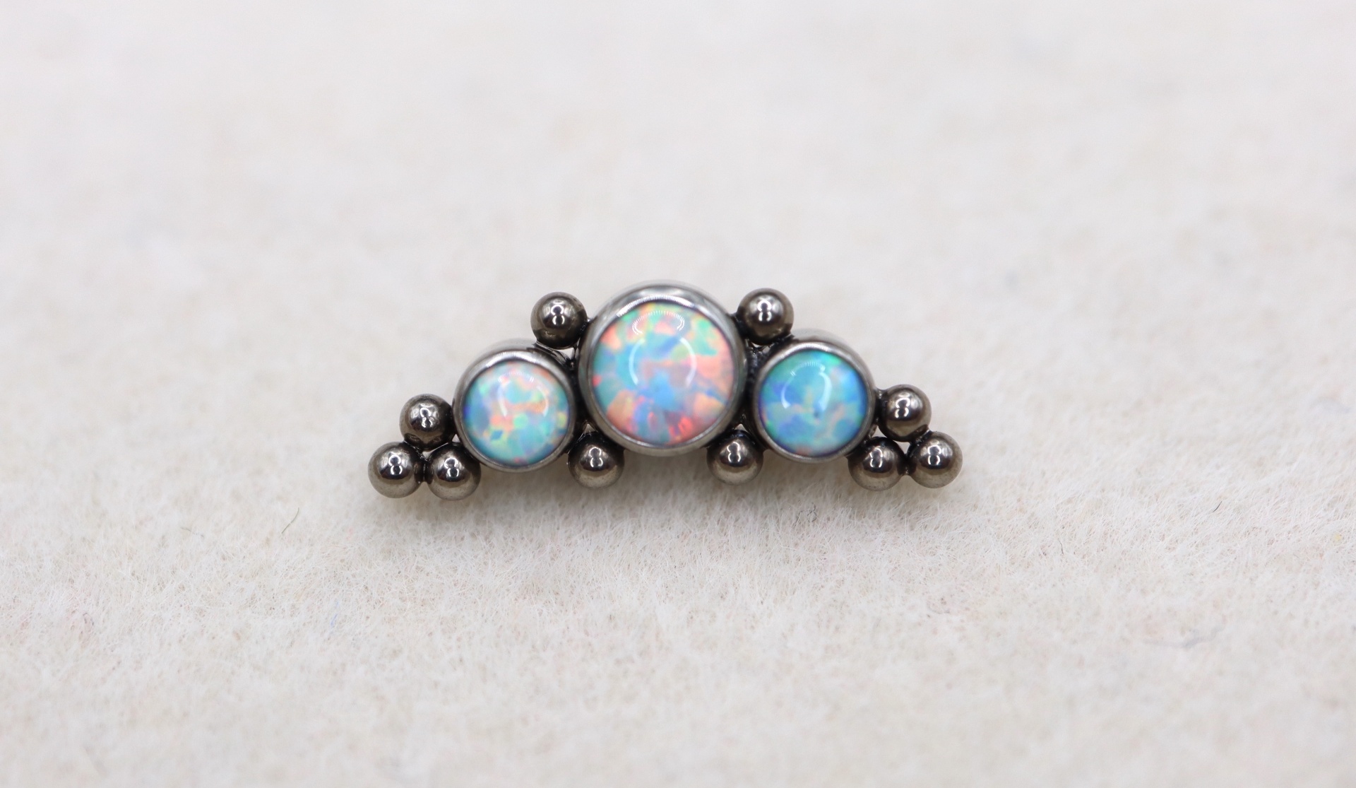 Piercing labret com três pedras opala brancas.