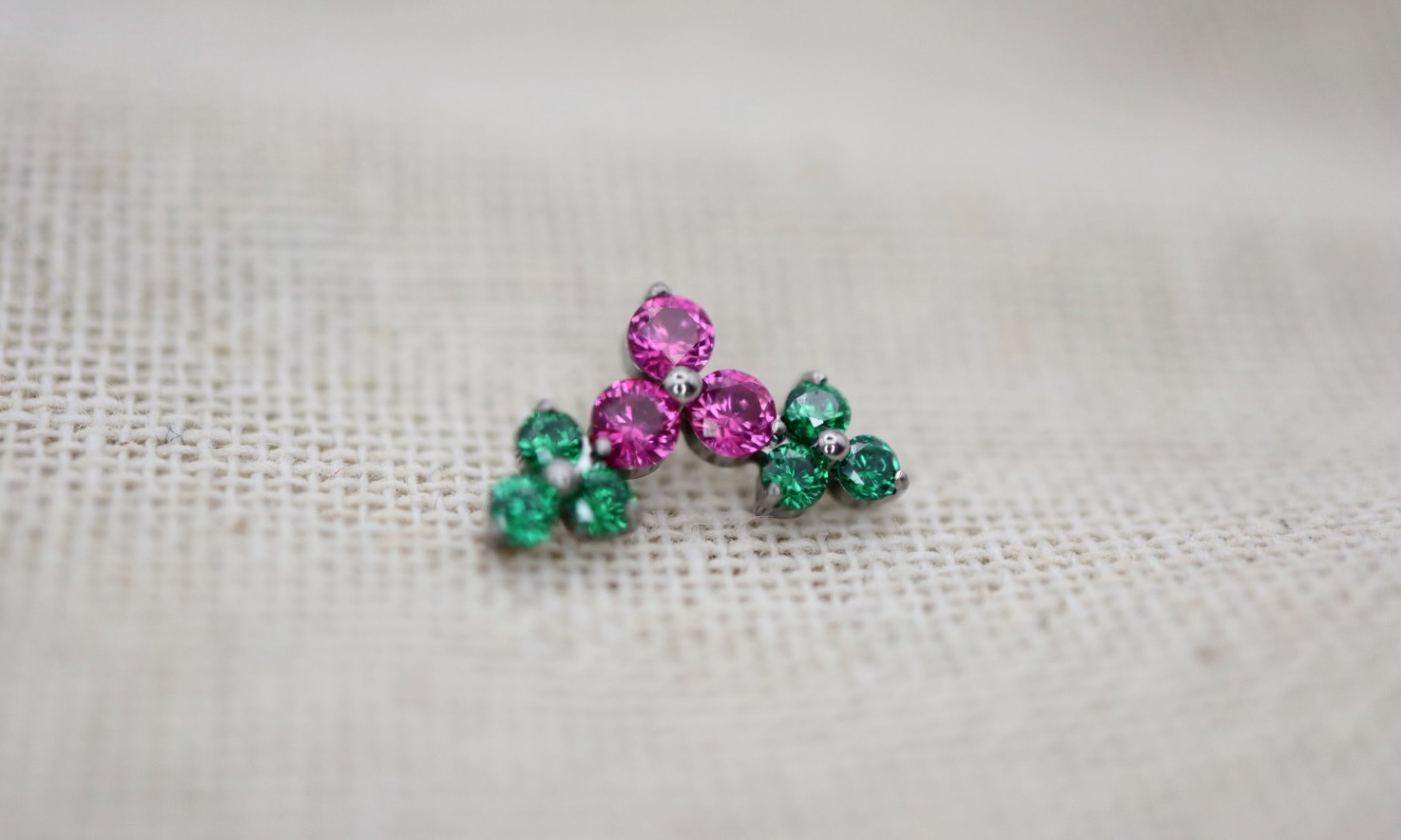 Piercing labret com um cluster composto por uma trinity rosa e duas verdes.