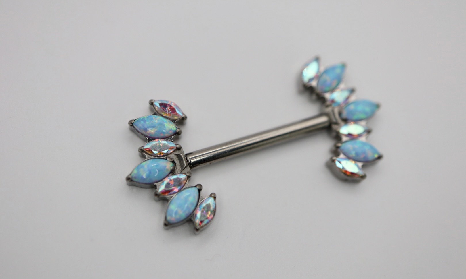 Piercing barbell com cluster de zircónias em tom aurora boreal e opalas azuis, de 13mm. Abertura em sistema de push-pin, com espessura de 1.6mm. Uma jóia confecionada em titânio ASTM F-136, o material mais indicado para perfuração corporal, altamente resistente a desgaste e erosão e livre de níquel e outros componentes que possam causar qualquer reação alérgica no corpo humano.