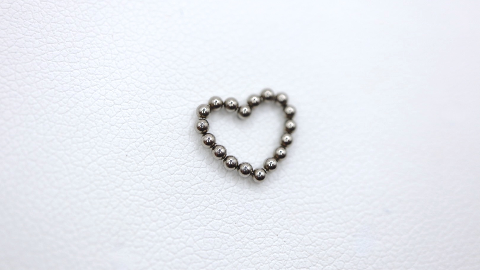 Colar em forma de coração feito de esferas metálicas prateadas numa superfície branca texturizada