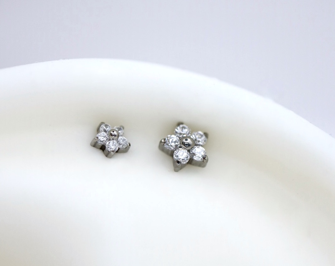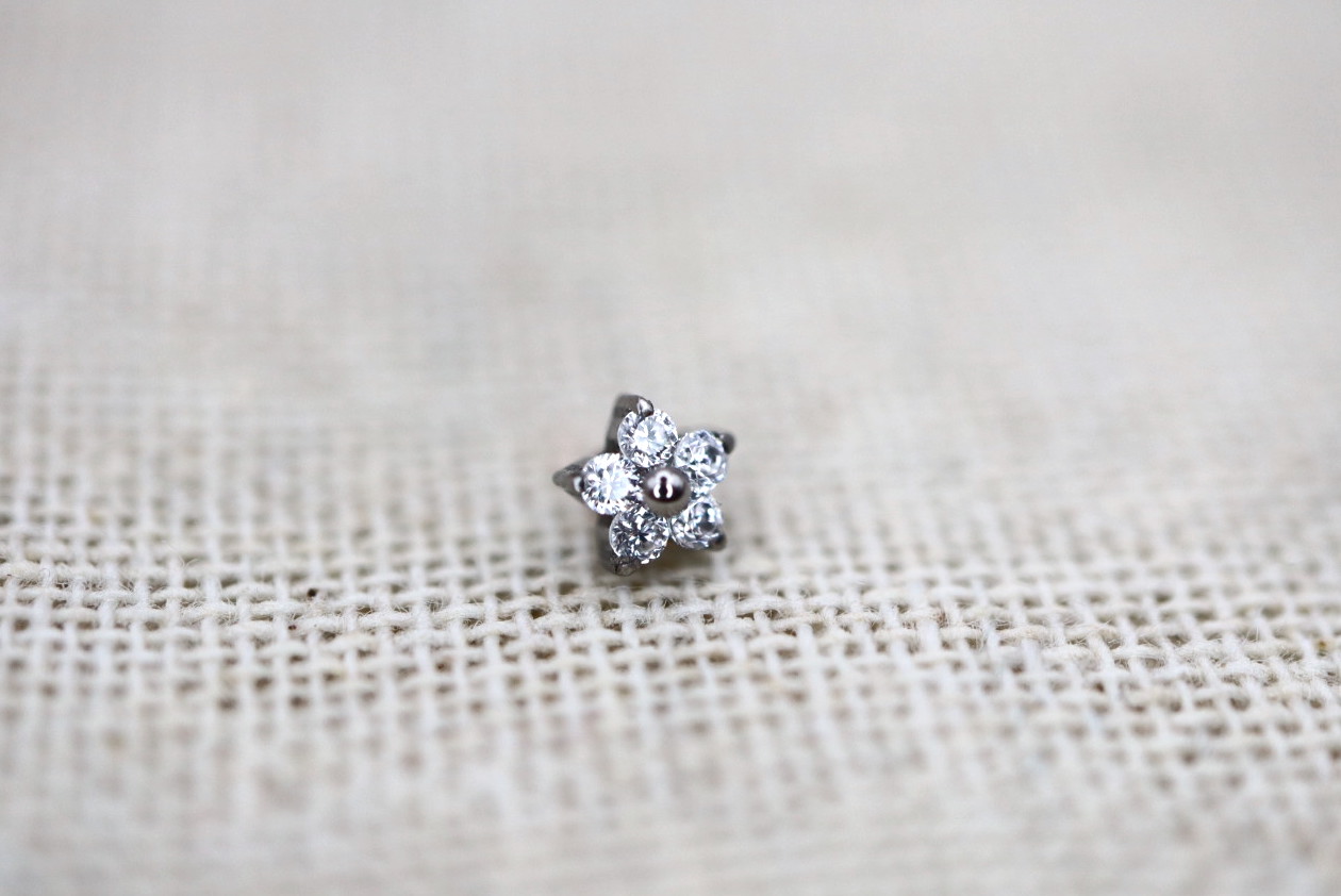Piercing labret com uma flor de zircónias, disponível em 3mm e 4mm.