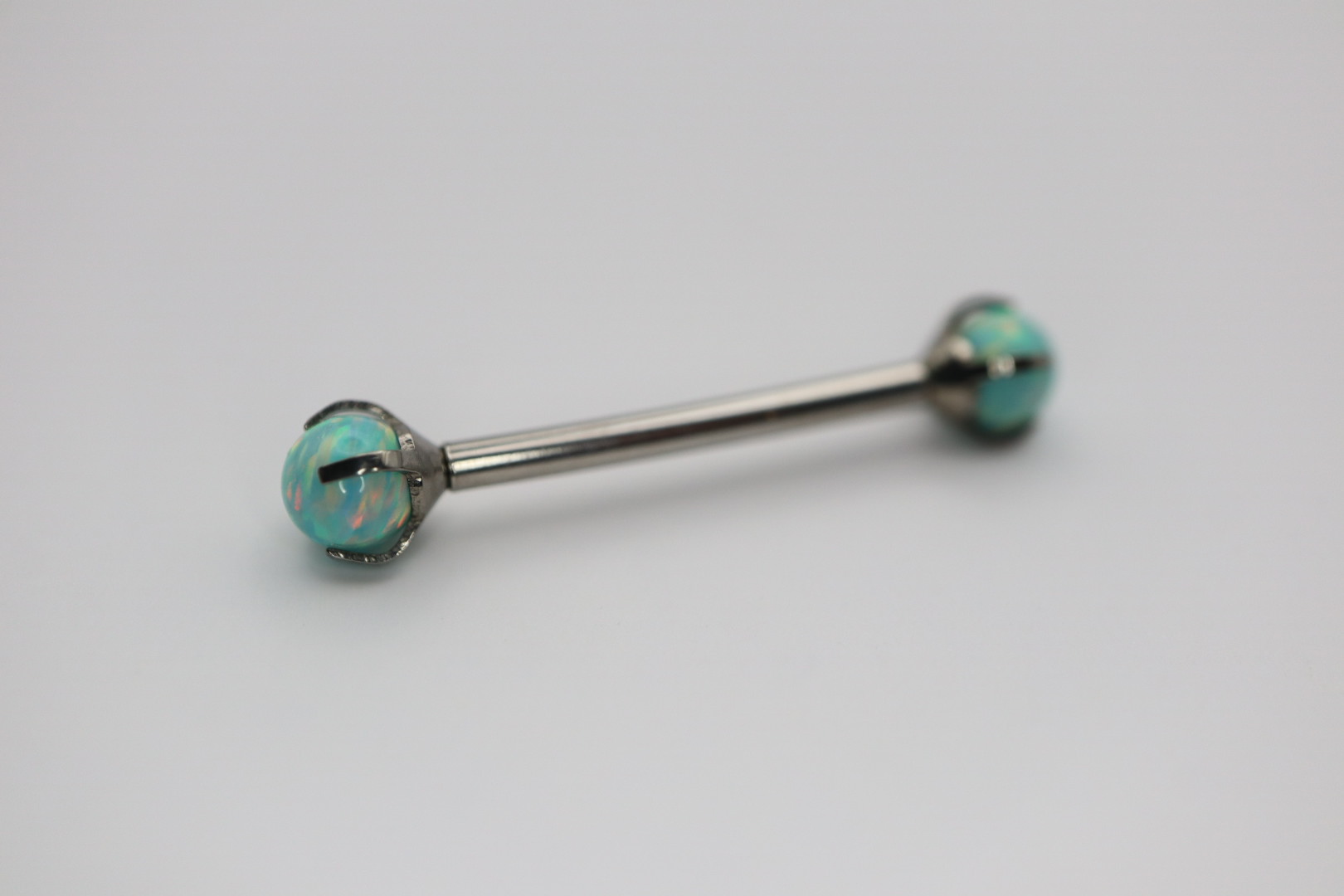 Piercing barbell com duas pedras naturais de 4mm. Abertura em sistema de rosca interna, com espessura de 1.6mm. Uma jóia confecionada em titânio ASTM F-136, o material mais indicado para perfuração corporal, altamente resistente a desgaste e erosão e sem componentes que possam causar qualquer reação alérgica no corpo humano.