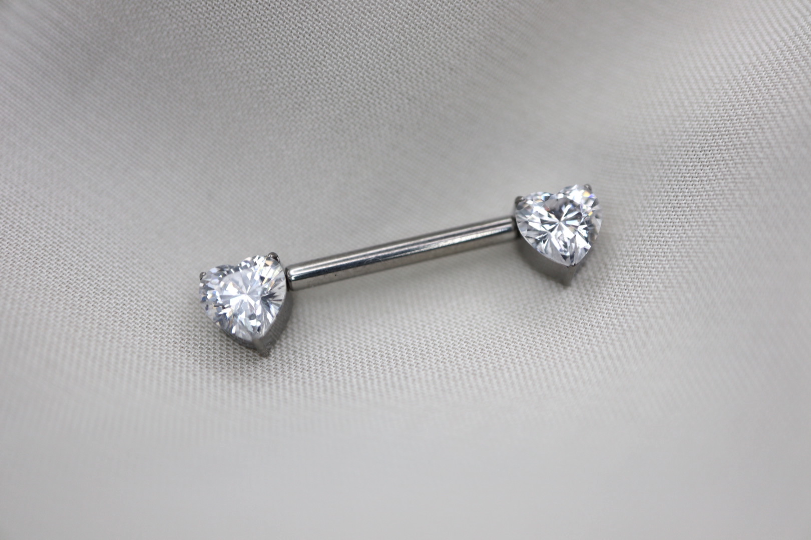 Piercing barbell com duas zircónias cravejadas em forma de coração. Abertura em sistema de push-pin, com espessura de 1.6mm. Uma jóia confecionada em titânio ASTM F-136, o material mais indicado para perfuração corporal, altamente resistente a desgaste e erosão e livre de níquel e outros componentes que possam causar qualquer reação alérgica no corpo humano.