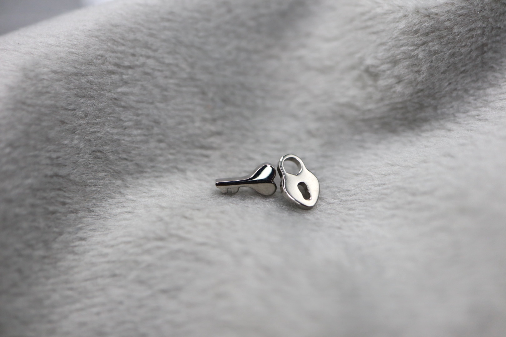 Conjunto com dois piercings labret com uma chave e um cadeado