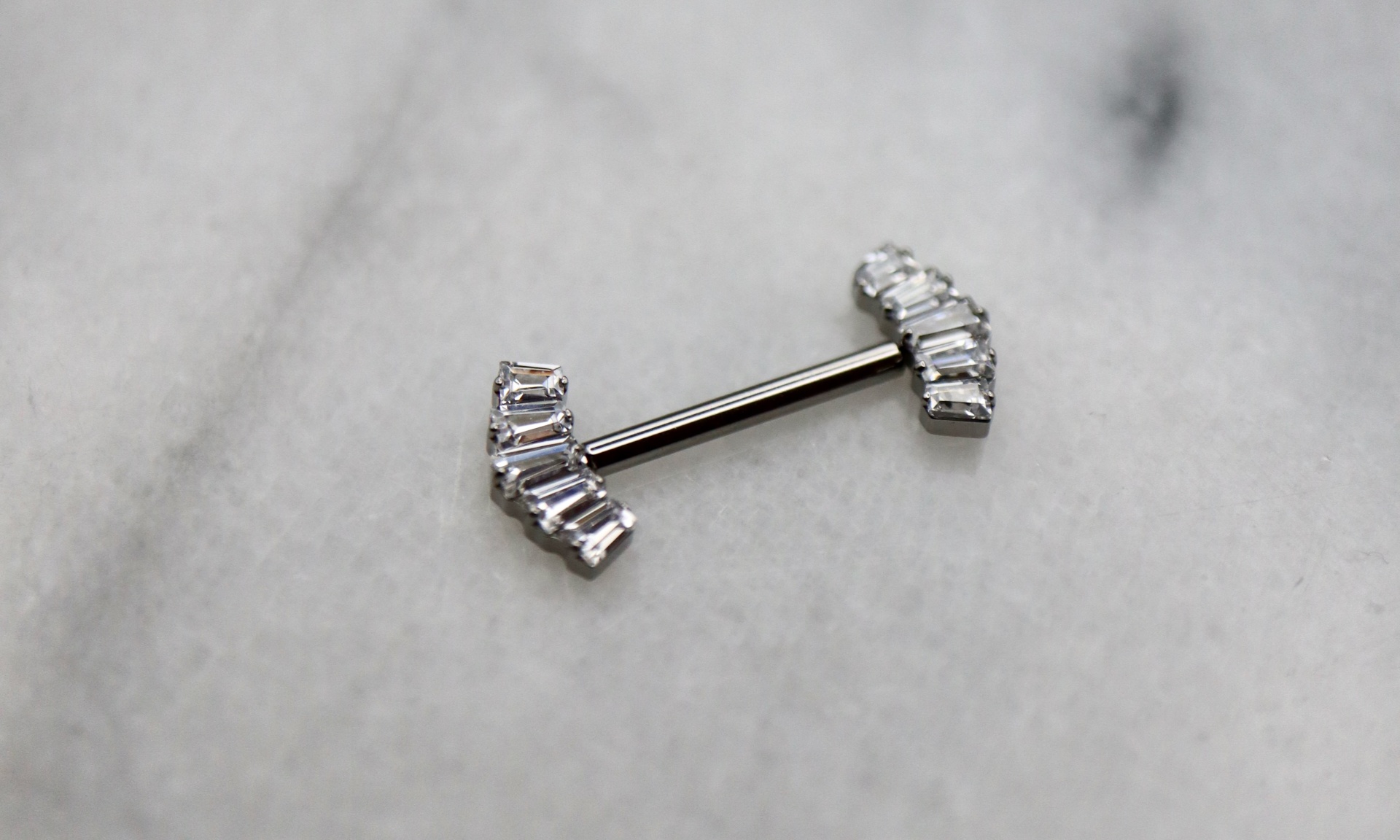 Piercing barbell com zircónias laminadas de 10mm. Abertura em sistema de push-pin, com espessura de 1.6mm. Uma jóia confecionada em titânio ASTM F-136, o material mais indicado para perfuração corporal, altamente resistente a desgaste e erosão e livre de níquel e outros componentes que possam causar qualquer reação alérgica no corpo humano.