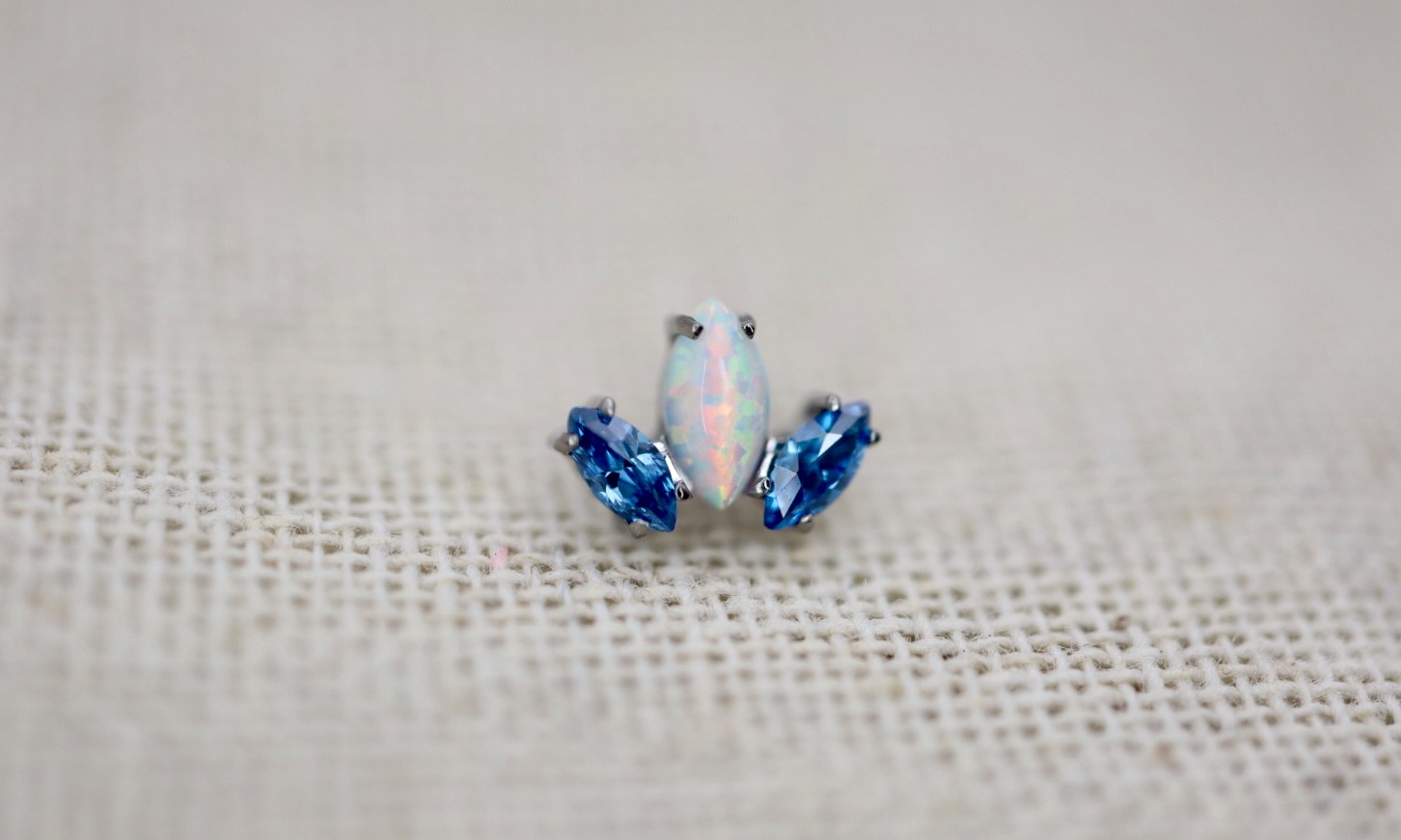 Piercing labret com uma opala e duas zircónias azuis.