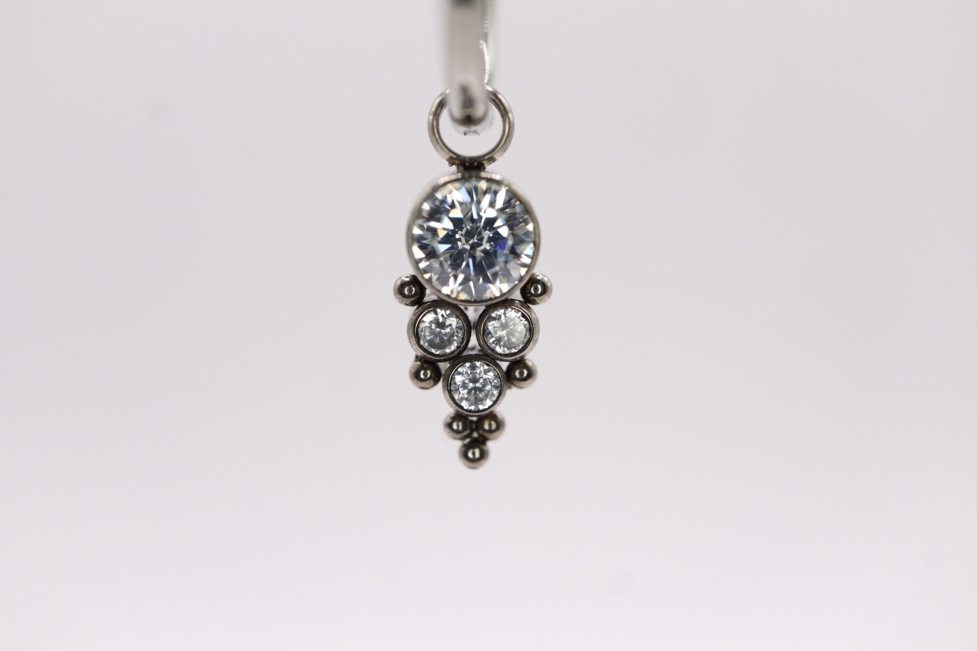 Uma jóia confecionada em titânio ASTM F-136, o material mais indicado para perfuração corporal, altamente resistente a desgaste e erosão e livre de níquel e outros componentes que possam causar qualquer reação alérgica no corpo humano.