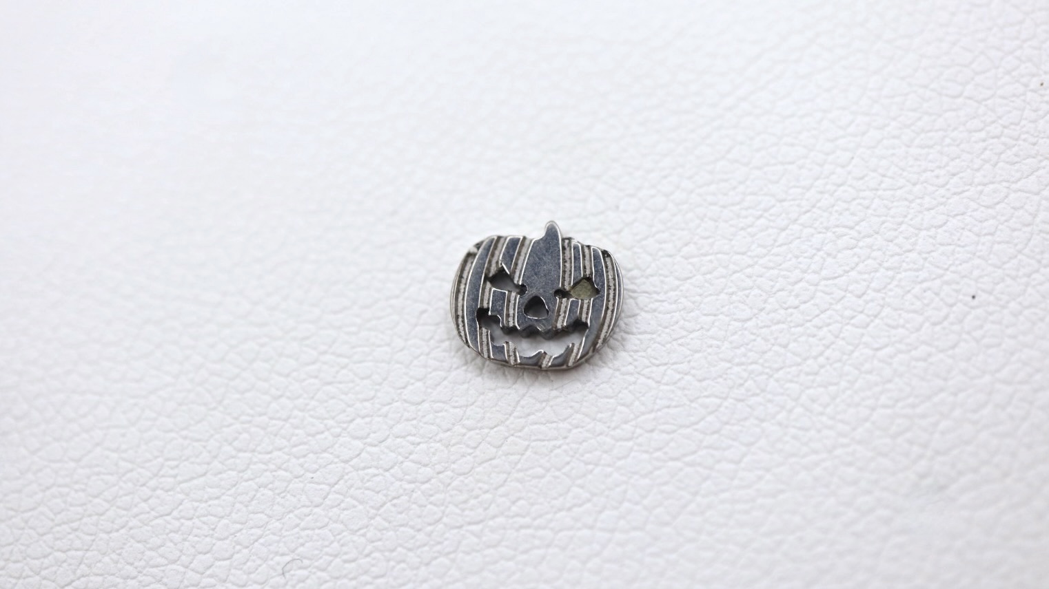 Broche de abóbora de Halloween em metal prateado sobre superfície branca texturizada.