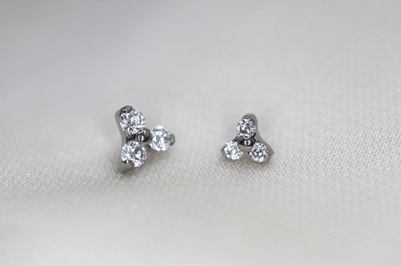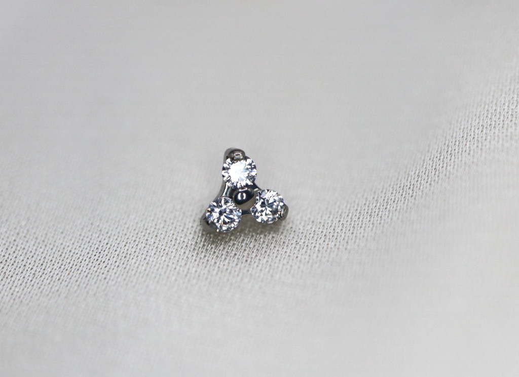 Piercing labret com trinity de zircónias. Abertura em sistema de rosca interna. Minimalista, elegante e versátil, possível de ser utilizado em várias perfurações auriculares ou faciais. Uma jóia confecionada em titânio ASTM F-136, o material mais indicado para perfuração corporal, altamente resistente a desgaste e erosão e livre de níquel e outros componentes que possam causar qualquer reação alérgica no corpo humano.