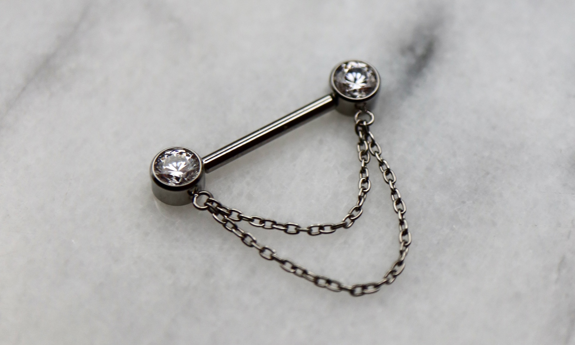 Piercing barbell com duas zircónias de 5mm, unidas por uma corrente dupla. Abertura em sistema de push-pin, com espessura de 1.6mm. Uma jóia confecionada em titânio ASTM F-136, o material mais indicado para perfuração corporal, altamente resistente a desgaste e erosão e livre de níquel e outros componentes que possam causar qualquer reação alérgica no corpo humano.